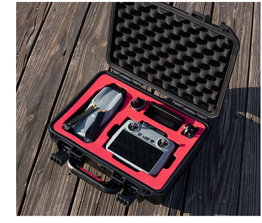 Unutra, pjenasti odjeljci izrezani po mjeri sigurno drže sklopiv dron DJI Air 3, punjač s više priključaka, punjač baterija, daljinski upravljač DJI RC 2 ili RC-N2, kabele, filtre za objektive i rezervne propelere. Podstavljani unutarnji poklopac dodaje dodatni sloj zaštite, sprječavajući pomicanje i habanje tijekom prijevoza.