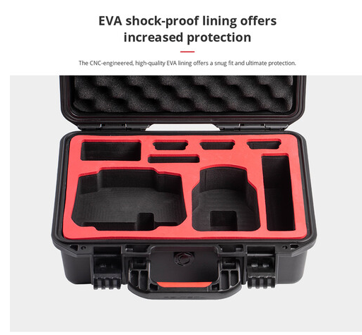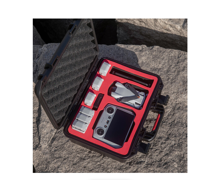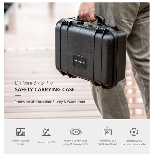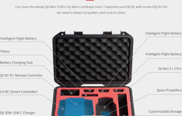 Unutra, precizno izrezana pjenasta umetka i poklopac obložen pjenom sigurno drže sklopljeni DJI Mini 3 ili Mini 3 Pro, daljinski upravljač DJI RC ili RC-N1, do sedam baterija (uključujući jednu u dronu), punjač s više priključaka, filtre, kabele i rezervne propelere. Zaključavanje s dvostrukim kopčama osigurava čvrsto prianjanje, dok automatski ventil za otpuštanje tlaka izjednačava unutarnji tlak tijekom zračnog putovanja. Dodatne značajke poput sklopive ručke za nošenje i otvora za lokot od nehrđajućeg čelika poboljšavaju prenosivost i sigurnost.