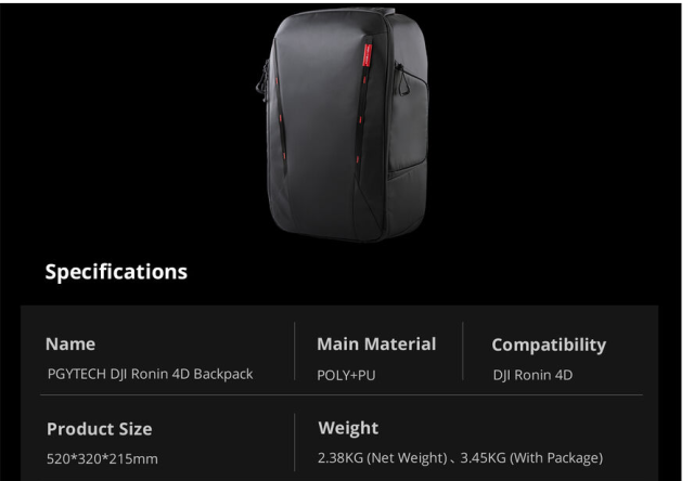 PGYTECH ruksak P-CB-245 za DJI Ronin 4D integrirano je rješenje koje kombinira sigurno pohranjivanje s operativnom podrškom u pokretu za sustav gimbala Ronin 4D. Dizajniran za nošenje kompletnog kompleta Ronin 4D, ruksak koristi podesive pregrade na kopču i petlju za učinkovito organiziranje kućišta gimbala, baterija, leća i dodatne opreme.