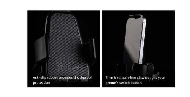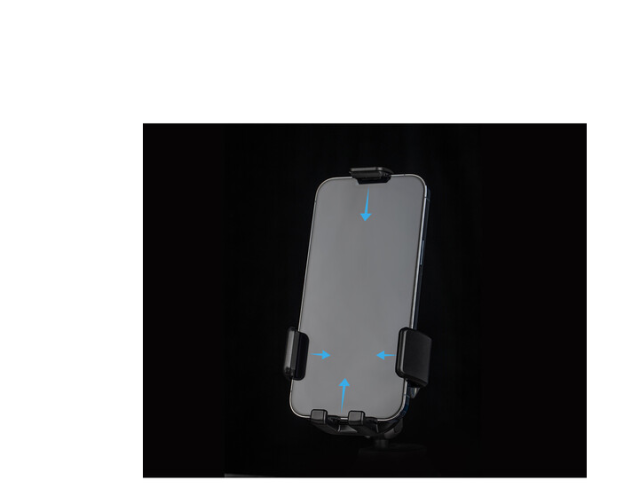 Držač ima otvaranje pritiskom na gumb i gornje i bočne stezaljke koje se zatvaraju stiskanjem, u kombinaciji s protukliznim gumenim podlogama i stabilizacijskim nožicama, osiguravajući da je vaš telefon sigurno pričvršćen sa svih strana. Kuglasta glava nosača omogućuje nagib od 180° i rotaciju od 360° za precizno podešavanje kuta, dok prostor između nožica sadrži opcionalni kabel za napajanje ili prijenos podataka. Podržava pametne telefone do 300 g, a ovaj držač kombinira snagu, fleksibilnost i jednostavnost korištenja.