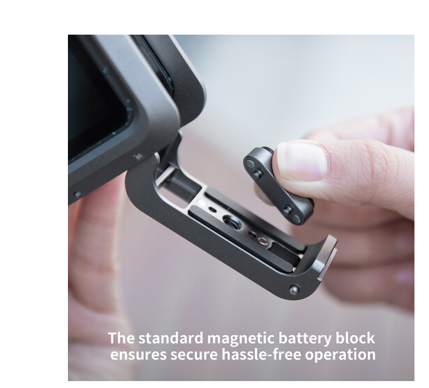 Integrirani magnetski blok baterija osigurava pouzdanu napajnost, dok vam praktično bočno dugme za otključavanje omogućuje zamjenu baterija ili medija bez skidanja okvira. Otvoreni USB-C priključak omogućuje neprekidno punjenje tijekom rada, što ovaj okvir čini izvrsnim izborom za duža snimanja, vloganje i profesionalno stvaranje sadržaja.