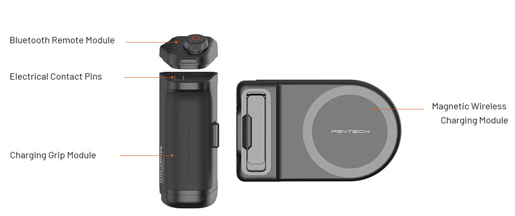 Odvojiva Bluetooth kontrola okidača omogućuje bežično upravljanje s udaljenosti do 32,8 ft (10 m), omogućujući snimanje fotografija, snimanje videozapisa, zumiranje i druge funkcije ovisno o vašem pametnom telefonu. Modul držača također sadrži Li-ion bateriju od 3000 mAh s USB-C izlazom i bežičnim punjenjem, koja služi i kao prijenosna power bank. Izrađen od ABS-a + PC-a, aluminijske legure i cinkove legure, lagan je, izdržljiv i ima CE, FCC, ROHS i PSEJ certifikate. Imajte na umu da je ovaj držač optimiziran za pametne telefone kompatibilne s MagSafeom i ne preporučuje se za uređaje tvrtki Samsung, Sony, vivo ili Google.