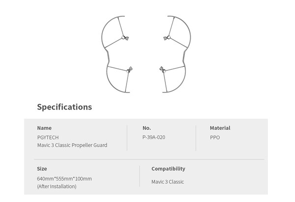 PGYTECH P-39A-020 štitnici propelera za DJI Mavic 3 Classic povećavaju sigurnost leta štiteći propelere, ljude i okolnu imovinu. Izrađeni od materijala visoke čvrstoće na savijanje, ovi lagani štitnici idealni su za letenje u zatvorenom prostoru i početnike pilote.