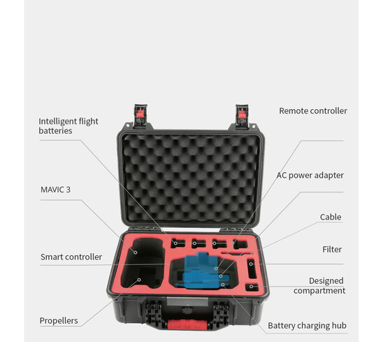 Unutrašnjost ima poklopac obložen pjenom i veliki umetak od pjene izrezan po mjeri dizajniran za sigurno držanje drona DJI Mavic 3, četiri inteligentne baterije za let, pametnog ili daljinskog upravljača, propelera, kabela, filtera, AC adaptera i čvorišta za punjenje baterija. Sustav dvostrukog zasuna s podrškom za lokot i integriranim ventilom za uravnoteženje tlaka dodaje dodatnu sigurnost i osigurava siguran prijevoz zrakom.
