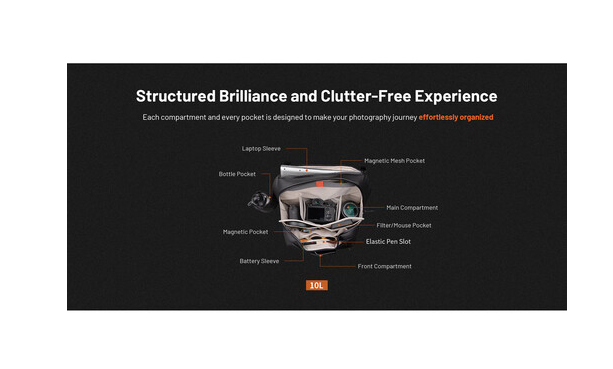 Unutrašnjost torbice sadrži podesive podstavljene pregrade, unutarnji pretinac za baterije i magnetske džepove koji uredno organiziraju pribor poput baterija, filtera, kabela, power bankova i tvrdih diskova. Široko otvoreni školjkasti dizajn omogućuje brz pristup vašoj opremi, dok je prednji pretinac za brzi pristup savršen za osnovne stvari poput telefona, kartica i ključeva.