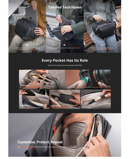 PGYTECH OneGo Solo Sling Bag V2 (P-CB-155) je pažljivo dizajnirana torba za fotoaparat za svakodnevnu upotrebu, napravljena za fotografe, filmaše i kreativce u pokretu. S kapacitetom od 10 litara, udobno drži fotoaparat i do tri objektiva u glavnom odjeljku, dok namjenski stražnji džep sigurno pristaje 14" MacBook ili 12,9" iPad Pro.