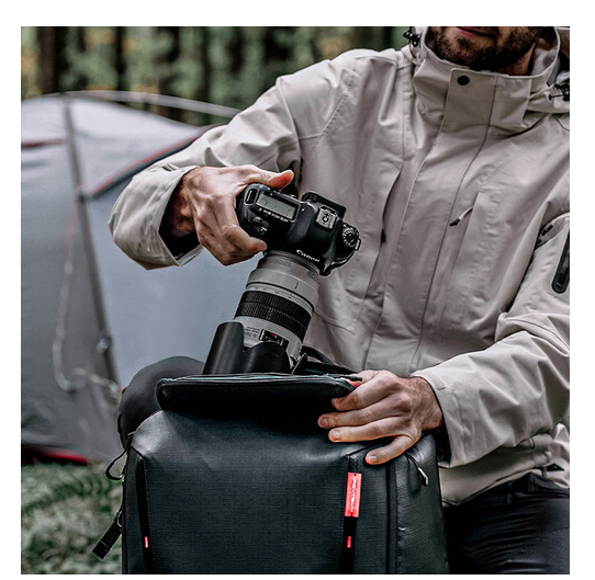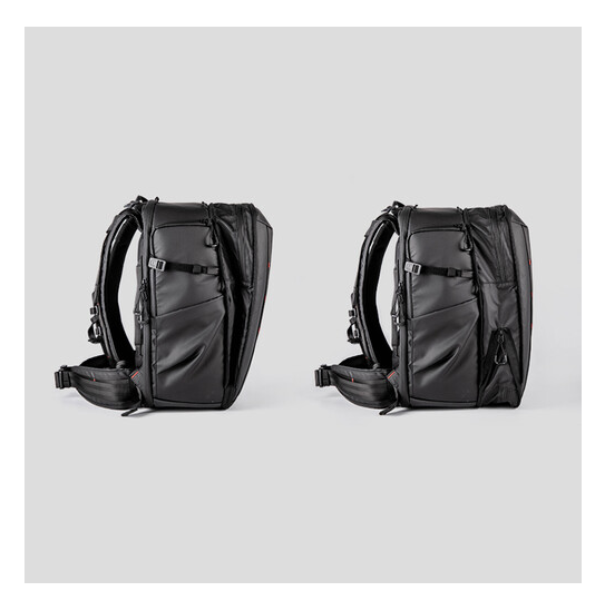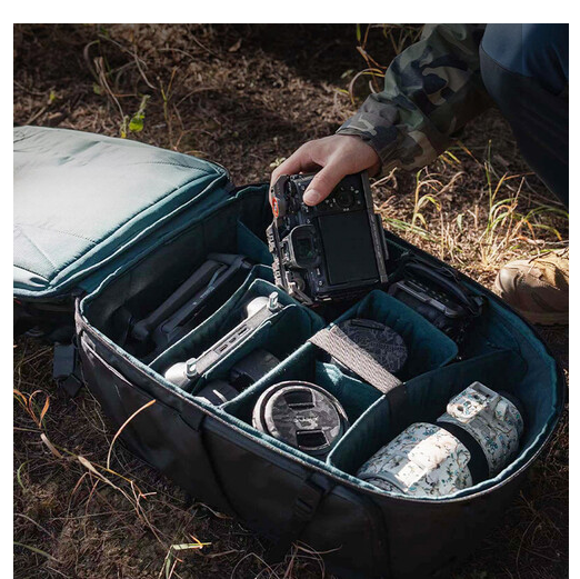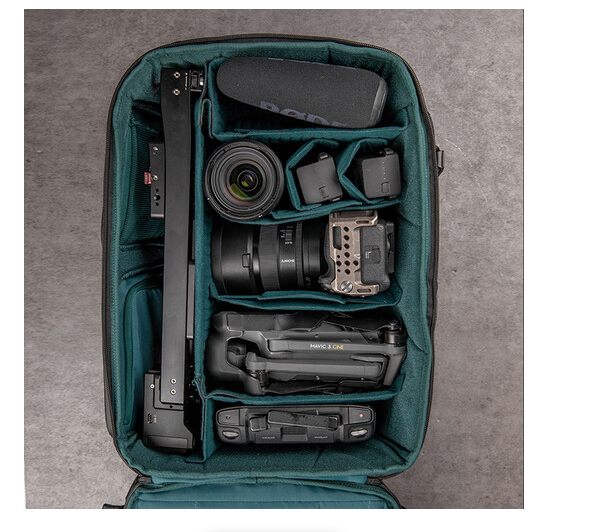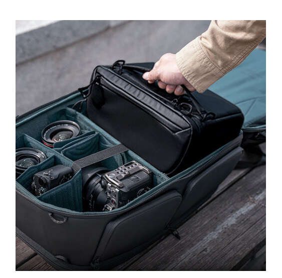 Njegova znanstveno strukturirana unutrašnjost sadrži debele, fleksibilne pregrade na kopču koje sigurno organiziraju fotoaparate, objektive, dronove i osobne predmete. Nadograđeni prednji pretinac podržava proširenje u V i H obliku, te lako prima gimbal stabilizatore i veće dodatke. Široki stražnji otvor omogućuje pakiranje u ravnini za brzo postavljanje i učinkovit pristup, dok vam brzi pristup s vrha i s desne strane omogućuje da uzmete objektive s dugim žarišnim duljinom bez vađenja torbe.