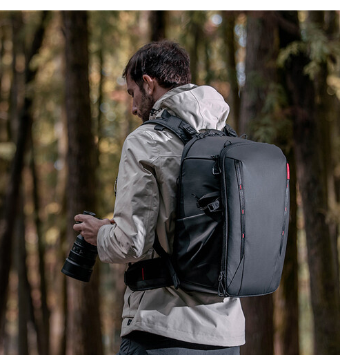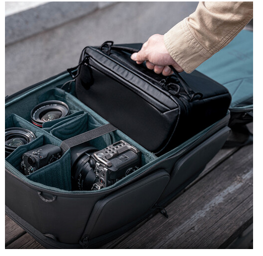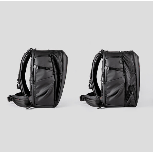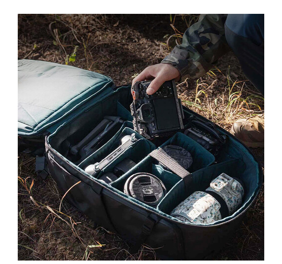 Njegova znanstveno strukturirana unutrašnjost pruža namjenski prostor za fotoaparat i osobne stvari, dok debele, fleksibilne pregrade omogućuju sigurno i prilagodljivo organiziranje. Unaprijeđeni prednji pretinac podržava proširenje u V i H obliku, što ga čini idealnim za pohranu gimbal stabilizatora ili dodatne opreme. Široki stražnji otvor omogućuje ravno pakiranje, a dvostruki otvori za brzi pristup omogućuju vam da brzo dohvatite teleobjektive s dugim žarišnim duljinama s vrha ili desne strane.