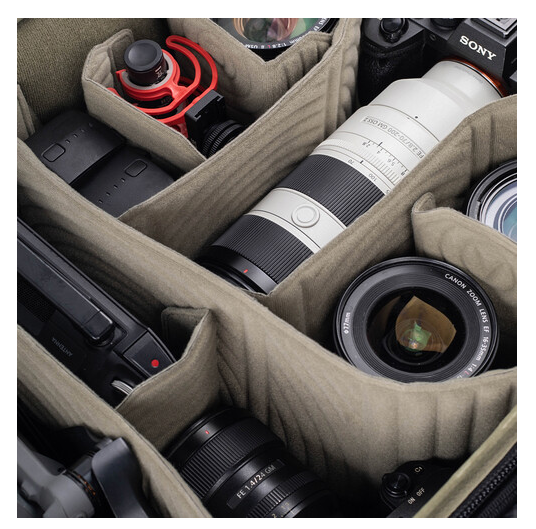 Ruksak ima gornji pretinac s preklopnim zatvaračem za fleksibilno pohranjivanje i podesivu umetku za fotoaparat u glavnom pretincu za sigurno organiziranje fotoaparata, leća i dodatne opreme. Brzi bočni pristup omogućuje brzo vađenje opreme bez potpunog otvaranja ruksaka. Promišljeni dodaci uključuju bočni džep za bocu vode, skriveni donji džep, držač za stativ i pretinac za laptop.