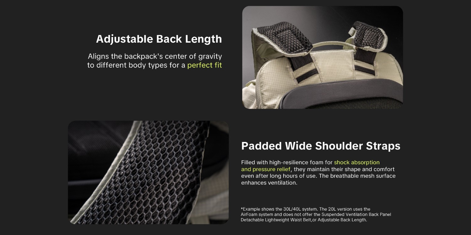 | Sustav ovjesa | Sustav ovjesa AirFoam ○Metalni okvirni sustav ○Jednodijelna prozračna stražnja ploča ○Odvojivi lagani remen ○Podesivi remen za prsa | AceFrame sustav ovjesa planinarske klase ○Patentirani sustav dvostrukog okvira ○Stražnja ploča s visećim ventilacijskim otvorom ○Odvojivi lagani remen za struk ○Podstavljene široke naramenice ○Podesiva duljina leđa ○Podesivi remen za prsa | |
