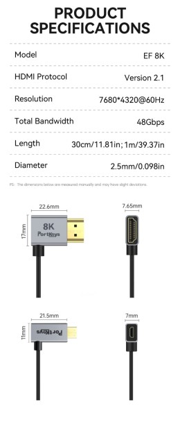 Portkeys 8K HDMI kabel (A na Micro HDMI D) 0,3 m je kompaktan kabel visokih performansi dizajniran za besprijekoran prijenos 8K videa. Idealan za spajanje kamera na monitore i druge uređaje kompatibilne s HDMI-jem, njegova kratka duljina od 0,3 metra smanjuje gužvu kabela, što ga čini savršenim za pojednostavljene postavke u profesionalnoj videoprodukciji.