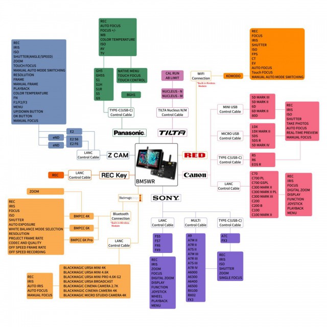 Canon: 5D Mark III, 5D Mark II, 6D, 6D Mark II, 80D (Mini USB), 1DX, 1DX Mark II, 5DS, 5DS R, 5D Mark IV (Micro USB), R5, R6, C70, EOS R ( Type-C/USB-C), C700 PL, C700 GSPL, C300 Mark 2, C300 Mark 2 PL, C200, C200B, C100, C100 Mark 2 (LANC)
