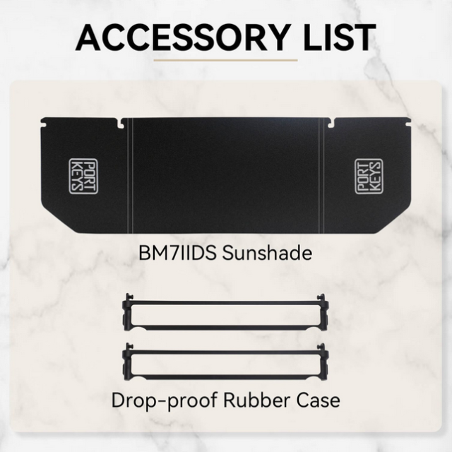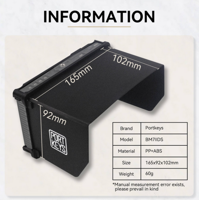 Portkeys BM7IIDS je lagana, sklopiva zaštitna folija za sunce dizajnirana posebno za monitor BM7 II DS, izrađena od izdržljivog PP+ABS materijala i težine samo 60 g s dimenzijama 165x92x102 mm, pružajući učinkovito smanjenje odsjaja u svijetlim okruženjima snimanja, a istovremeno održava prenosivost i jednostavno pričvršćivanje.