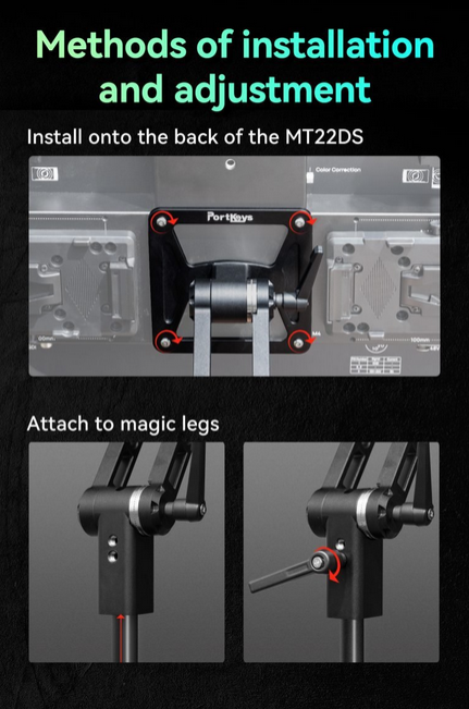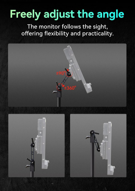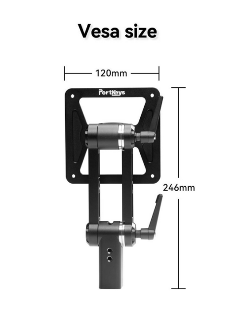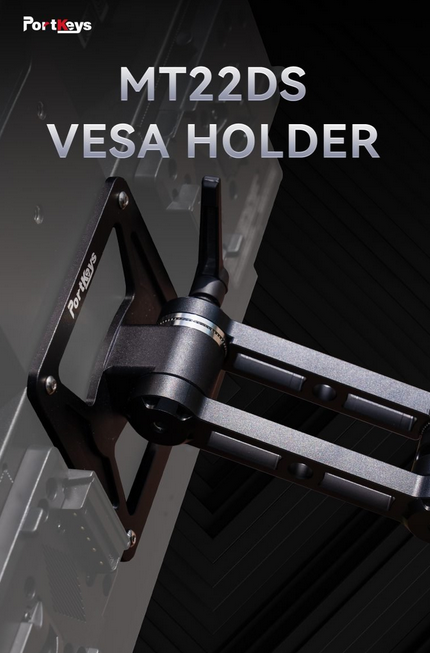 Portkeys MT22DS VESA držač pruža robusno i podesivo rješenje za montažu prilagođeno monitoru MT22DS. Omogućuje korisnicima slobodno podešavanje kuta tako da monitor prati pogled, pružajući fleksibilnost i praktičnost u bilo kojem postavu. Držač podržava nagib od 90° i rotaciju od 360° za precizno pozicioniranje. Instalacija je jednostavna s dva načina: pričvršćivanjem izravno na stražnju stranu MT22DS-a pomoću priloženih točaka za montažu ili spajanjem na čarobne nožice za produženi doseg i stabilnost. VESA-kompatibilan dizajn mjeri 120 mm vodoravno i 246 mm okomito, osiguravajući kompatibilnost sa standardnim nosačima i nosačima monitora.