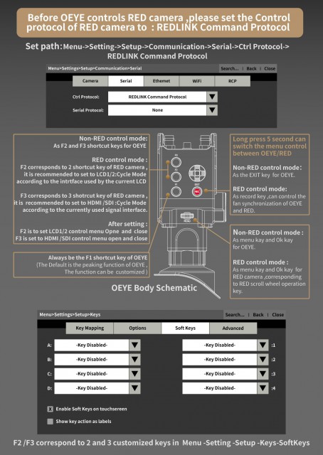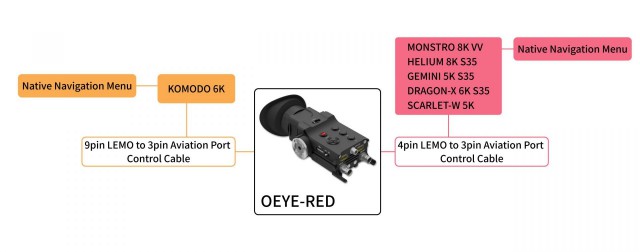 OLED tražilo kamere PortKeys OEYE-RED nudi izvornu kontrolu/pretraživanje izbornika RED Digital Cinema kamera (MONSTRO 8K VV, HELIUM 8K S35, GEMINI 5K S35, DRAGON-X 6K S35) i ima 3G-SDI I/O (do 1080p60 ) i istovremeno dostupni 4K HDMI I/O (do 24 fps u DCI 4K ili 30 fps u UHD). Opremljen je visokokvalitetnim 0,71" OLED zaslonom (200 cd/m2, 100 000:1), teži cca. 400 g i troši ~10 W. Tu je naravno i korekcija dioptrije (+8D – -3D) i bogata softverska oprema uklj. 3D LUT korekcije, mjerenje signala, prikaz u lažnim bojama, pomoć pri fokusiranju, povećanje slike itd.