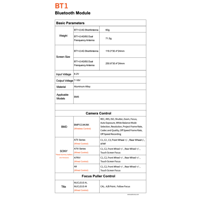 Serija Sony A7II / A7III / A7IV : Kamera serije Sony A7II / A7III / A7IV upravljajte žicom putem povezivanja BT1 na BM5. Kontrolni kabel s lažnom baterijom koji će biti spreman kasnije mjesec dana potrebno je kupiti zasebno.