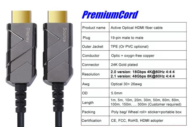 Optički HDMI 2.1 Ultra High Speed 8K@60Hz ili 4K@120Hz kabel koristi se za povezivanje dva audio/video uređaja putem modernog HDMI sučelja, kao što su HD-DVD/BluRay player i LCD/Plazma televizor. kabel prenosi digitalni audio i video i podržava HDCP zaštitu digitalizacije sadržaja.