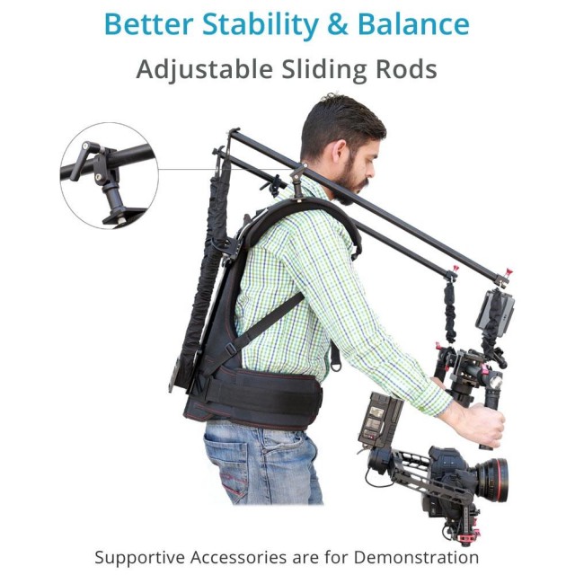 Lagan i podstavljen, prsluk je izrađen od prozračne tkanine koja se ne znoji i ima elastičnu najlonsku užet koja apsorbira udarce i koja eliminira stres i pruža potporu tijekom dugih sati snimanja. Prsluk se lako prilagođava svim tipovima tijela. Opremljena je prilagodbama u 3 područja - visina/ramena, napetost i struk. Možete jednostavno prilagoditi napetost gume i duljinu ruku mijenjajući položaj crvenih gumba na dasci ovisno o strukturi tijela i težini podešavanja. Možete prilagoditi struk od 28" do 46" kako bi odgovarao vašem stasu prilagođenim podešavanjem čičak traka. Push-fit kopče čine nošenje lakšim i ugodnijim. Gornji sustav omogućuje slobodno kretanje ramena. Rezultat je osjećaj veće lakoće i kontrole.