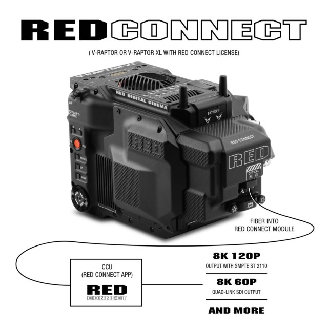 RED Connect modul povezuje se s kamerama V-RAPTOR ili V-RAPTOR XL (V-Lock) i omogućuje live streaming 8K videa pomoću usluge RED Connect. RED Connect omogućuje korisnicima strujanje RAW R3D datoteka izravno sa V-RAPTOR i V-RAPTOR XL sustava kamera preko IP-a na Camera Control Unit (CCU) u stvarnom vremenu, otvarajući izvanredan raspon kreativnih aplikacija od emitiranja uživo do virtualne produkcije do prave 8K VR produkcije.