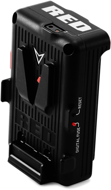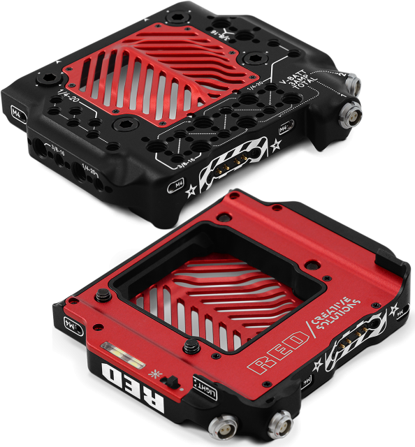 V-Lock i Gold Mount baterijski adapteri uključuju P-tap/D-tap i E-Fuse sigurnosni sustav i pogo sustav povezivanja za povezivanje s gornjom pločom. Ovi adapteri omogućuju fotoaparatu da prihvati V-Lock i Gold Mount baterije pune veličine.