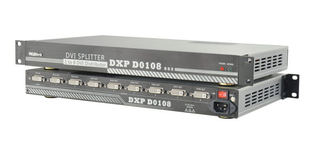 RGBlink DXP D0108 je visokoučinkovito 1-u-8 DVI/HDMI distribucijsko pojačalo u kompaktnom 1RU formatu. Podržava širok raspon VESA i SMPTE rezolucija do 2560×816@60 Hz i kompatibilan je s HDCP-om, pouzdano distribuira jedan video izvor na više zaslona za profesionalne AV, emitiranje i prezentacijske primjene.
