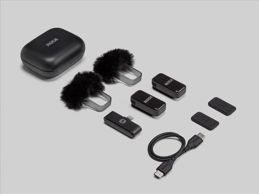 Wireless Micro dolazi sa svime što vam je potrebno za snimanje bežičnog zvuka profesionalne kvalitete : dva odašiljača s ugrađenim mikrofonima, jednim prijemnikom, pametnom kutijicom za punjenje, vjetrobranima, magnetima za pričvršćivanje na odjeću i USB-C kabelom za napajanje.