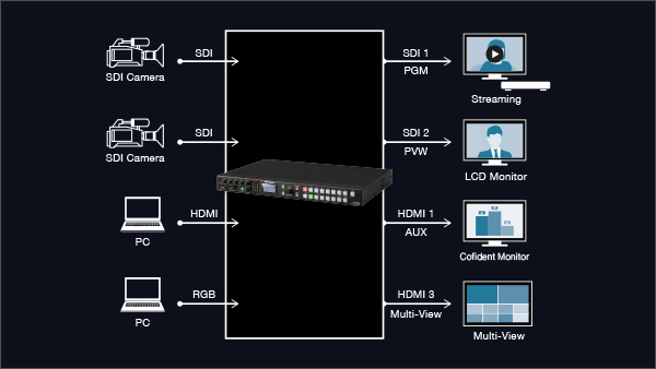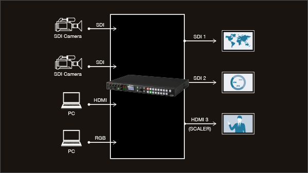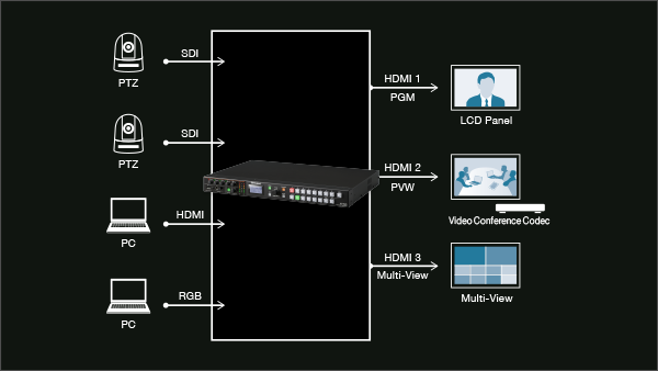 Matrični način rada olakšava slanje različitog sadržaja na dva ili tri odredišta zaslona s jednog preklopnika, a sve to uz miksanje zvuka programa i upravljanje PTZ udaljenim kamerama.