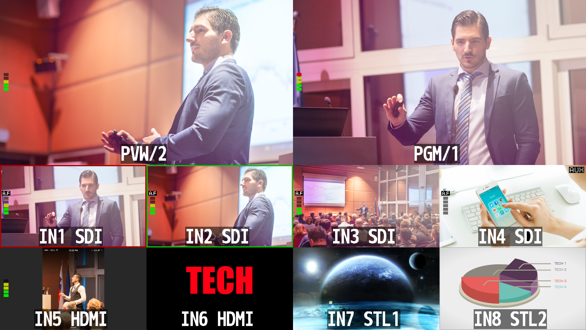 XS-62S može pregledati svih šest video ulaza, dvije statične slike, PGM i PVW na jednom monitoru putem Multi-View izlaza. Također možete prikazati izbornik s Multi-Viewom, što vam omogućuje podešavanje postavki bez promjene fokusa s prikaza pregleda. Od verzije 2.5 moguća je zamjena PGM/PVW prozora i uređivanje naziva oznaka ulaza.