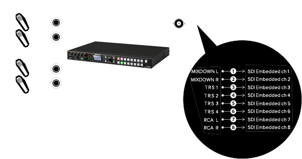 Ugradite do osam analognih audio ulaza na zasebne kanale na SDI 1 i 2 izlazima. Odaberite između raznih načina prijenosa - pre-efekt (dry), post-efekt i pre-fader (wet) ili post-efekt i post-fader (wet) - kako biste zadovoljili svoje potrebe postprodukcije nakon događaja uživo. Ova je značajka korisna i za višejezične događaje, omogućujući vam snimanje glasovne naracije ili jezičnog prijevoda na zasebnom audio kanalu.