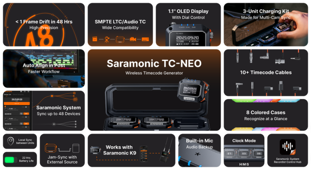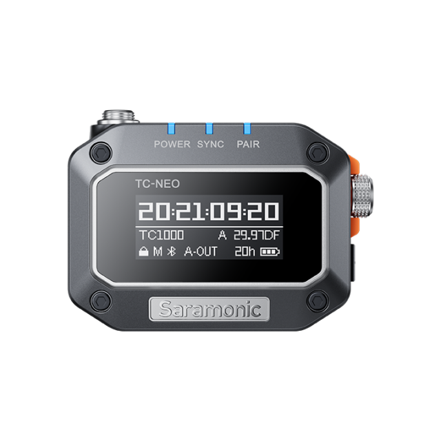 Saramonic TC-NEO je profesionalni bežični generator vremenskog koda dizajniran za preciznu i pouzdanu sinkronizaciju. Ima visokoprecizni TCXO s točnošću od ±0,5 ppm za minimalno odstupanje, više metoda sinkronizacije uključujući Bluetooth i 2,4 GHz , te dugo trajanje baterije od 22 sata za cjelodnevno snimanje.