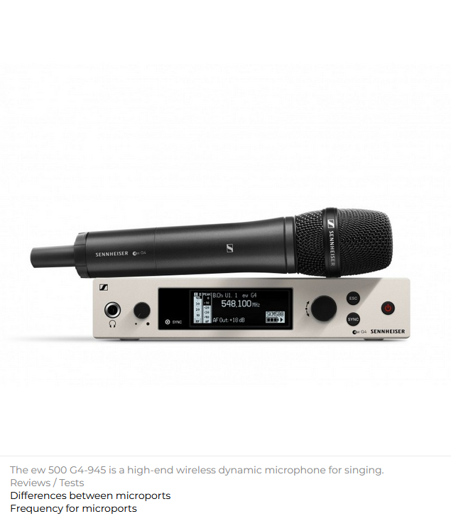 Sennheiser ew 500 G4-945 je vrhunski UHF bežični dinamički ručni mikrofonski sustav za pjevanje i govor, koji sadrži SKM 500 G4 odašiljač s izmjenjivom MMD 945-1 superkardioidnom kapsulom, 2880 podesivih frekvencija u propusnom opsegu od 72 MHz, HDX supresiju šuma, OLED zaslon, kontakte za punjenje i prijemnik za montažu u rack za kristalno čist zvuk uživo.