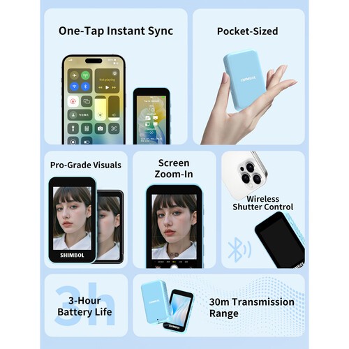 Shimbol CP5 Mini Black omogućuje jednostavno korištenje stražnje kamere vašeg telefona za selfije. LCD zaslon od 2,2” s rezolucijom od 480 × 800 podržava povećanje jednim klikom kako bi se održao omjer slike, dok bežično upravljanje zatvaračem omogućuje daljinsko snimanje. Sinkronizacija jednim dodirom osigurava brzo postavljanje s iPhone ili Android uređajima.