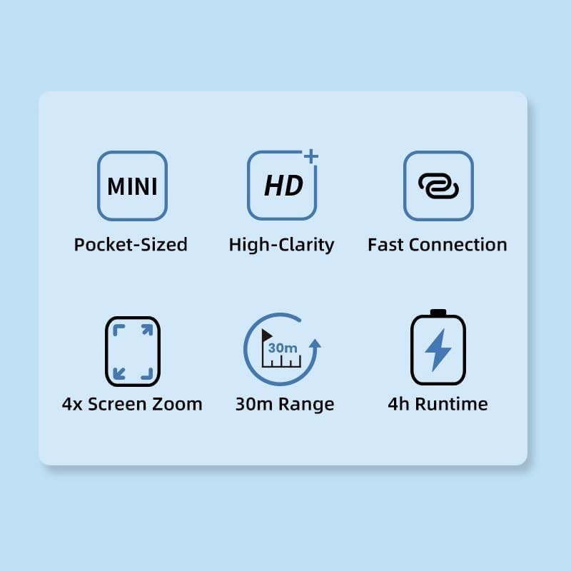 Shimbol CP5 Mini2 Blue pruža jednostavno i brzo rješenje za mobilne kreatore. S trenutnom bežičnom vezom jednim dodirom, uparuje se s iPhoneima u sekundama, omogućujući vam praćenje snimke bez ikakvog kompliciranog postavljanja. Njegov 2,4-inčni HD zaslon (480×800) pruža oštre i jasne slike, a pametni zum jednim klikom povećava sliku bez promjene omjera slike, održavajući precizno kadriranje. Težak samo 60 g, ostaje diskretan i neupadljiv u vašem kadru.