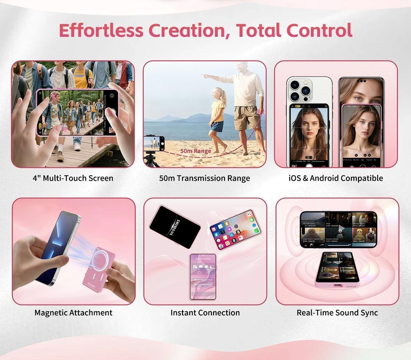 Opremljen 4-inčnim zaslonom osjetljivim na dodir rezolucije 640 × 1136, P4 podržava intuitivne geste poput zumiranja pinch-om, fokusiranja tap-om i navigacije povlačenjem za precizne postavke prije snimanja. Uređaj pruža glatko iskustvo u stvarnom vremenu s ultra niskom latencijom od 0,04 sekunde i stabilnom Bluetooth 5.0 vezom koja nudi bežični domet do 50 metara.