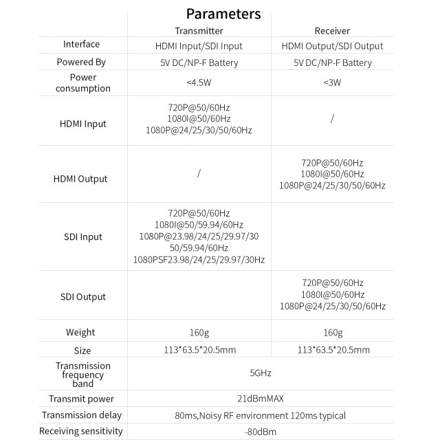 Komplet odašiljača i prijamnika koristi se za bežični prijenos do 1080p60 videa u pojasu od 5 GHz na udaljenosti od približno 182 m (linija vidljivosti) s latencijom od približno 80 ms. Sustav nudi HDMI i HD-SDI I/O (odašiljač je opremljen s 1x HDMI Type A i 1x HD-SDI ulazima, prijemnik je opremljen s 1x HDMI Type A i 1x HD-SDI izlazima), napajanje putem USB-a -C priključak (ili preko Sony L baterije -Series; nije uključen) i mogućnost primanja signala ne samo putem prijemnika, već i telefona i tableta. Obje jedinice imaju pasivno hlađenje za tihi rad, unutarnje antene i izvrsno čitljive OLED statusne zaslone.