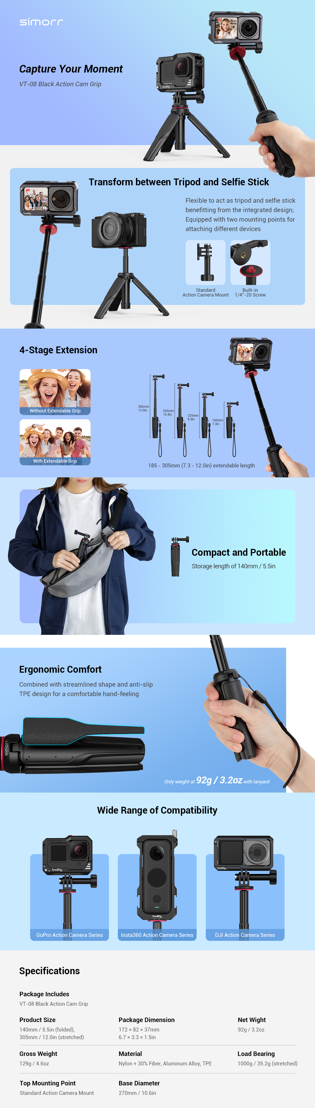 simorr VT-08 Action Cam Grip 3791 Proizvodi su izrađeni od najlona + vlakana, legure aluminija i drugih materijala, kompaktni su i prenosivi, a istovremeno stabilniji i nosiviji. Integrirani dizajn stativa i selfie sticka podržava slobodno prebacivanje po potrebi, a na vrhu se koriste konektori za akcijske kamere za povezivanje i proširenje koji su kompatibilni s akcijskim kamerama raznih marki, poput insta360, Gopro i DJI. Proizvod ima veličinu za pohranu od 14 cm, maksimalnu dimenziju u napetosti od 30,5 cm i teži samo 92 g.