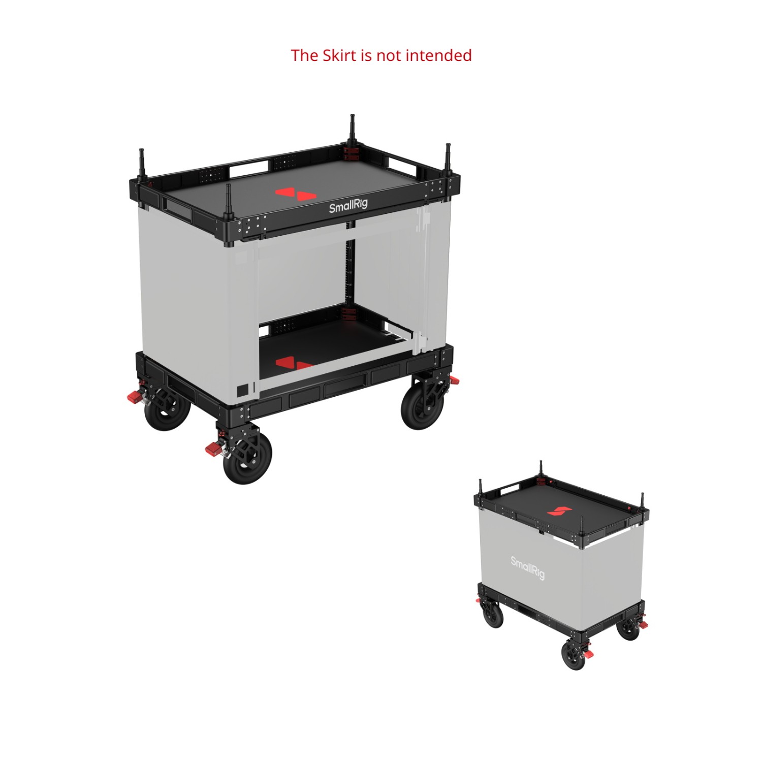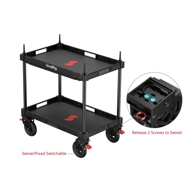 S dvoslojnim dizajnom platforme, gornji dio nudi više točaka za pričvršćivanje monitora, prijenosnih računala, bežičnih odašiljača i sustava napajanja, dok donji dio sigurno drži glomaznu opremu. Kolica pružaju iznimnu stabilnost i sigurno prevoze vašu opremu dok ste u pokretu.