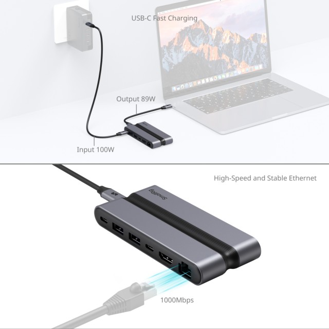 Uključuje USB-C kabel velike brzine od 50 cm / 19,7 inča s dvije glave koji podržava prijenos podataka od 10 Gbps za poboljšanu radnu učinkovitost. Neovisno pristanište prima kabele različitih duljina, promičući uredan radni prostor. Dodatno, bionička struktura poput peraje osigurava učinkovito odvođenje topline za sigurnu upotrebu. Kompaktna i prijenosna, ova priključna stanica idealna je za učinkovit digitalni stil života.