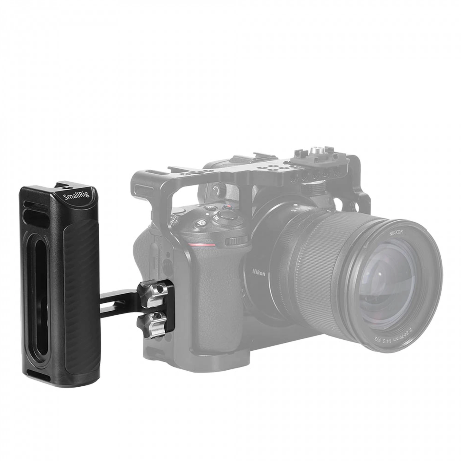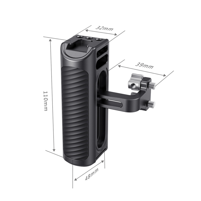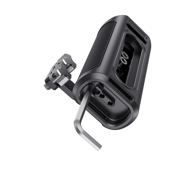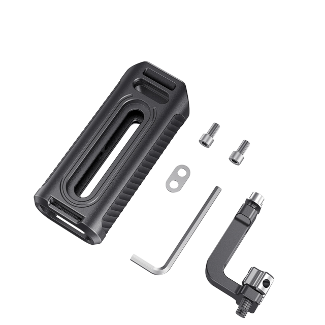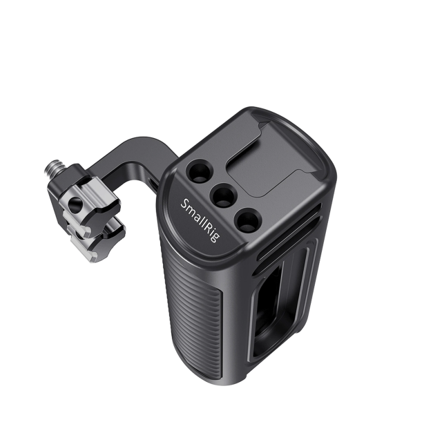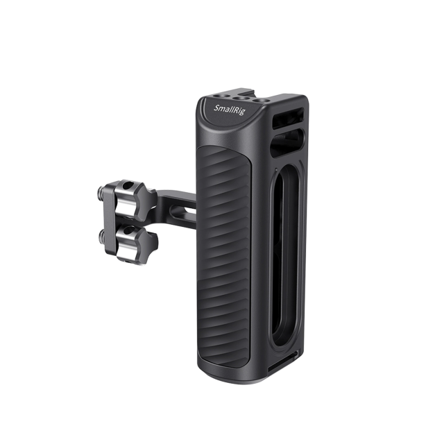 SmallRig HSS2425 aluminijski univerzalni bočni rukohvat dizajniran je za pružanje udobnog snimanja iz ruke za videografe. Pomoću ugrađenog šesterokuta na dnu, ručka se može podesiti gore i dolje prema vašim potrebama. Ako želite koristiti ručku s druge strane kaveza, upotrijebite šesterokut da uklonite spojni metalni dio ručke i promijenite smjer. Rukohvat se može montirati na lijevu ili desnu stranu okvira kamere pomoću dva vijka 1/4"-20. Dolazi s jednom hladnom papučicom i tri rupe s navojem 1/4"-20 za pribor za montažu. Težak je samo 220 g i ima aluminijsko kućište s neklizajućim premazom od silikonskog gela koji omogućuje udobno i jednostavno snimanje iz ruke. Ova se ručka također može koristiti s remenom za ruku za dodatnu sigurnost.