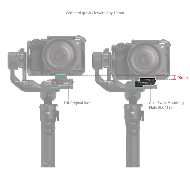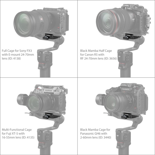 SmallRig Arca-Swiss montažna ploča za DJI RS 3 Mini 4195 dizajnirana je za podršku raznim drugim kamerama, kao što su Sony FX3 s objektivom 24-70 mm, Canon R5 s objektivom 24-70 mm, FUJIFILM X-T5 s objektivom 16-55 mm i LUMIX GH6 s objektivom 12-60 mm. Mogu se umetnuti sa strane ili odozgo. Komplet također pomaže u brzom prebacivanju između okomitog i vodoravnog skeniranja.