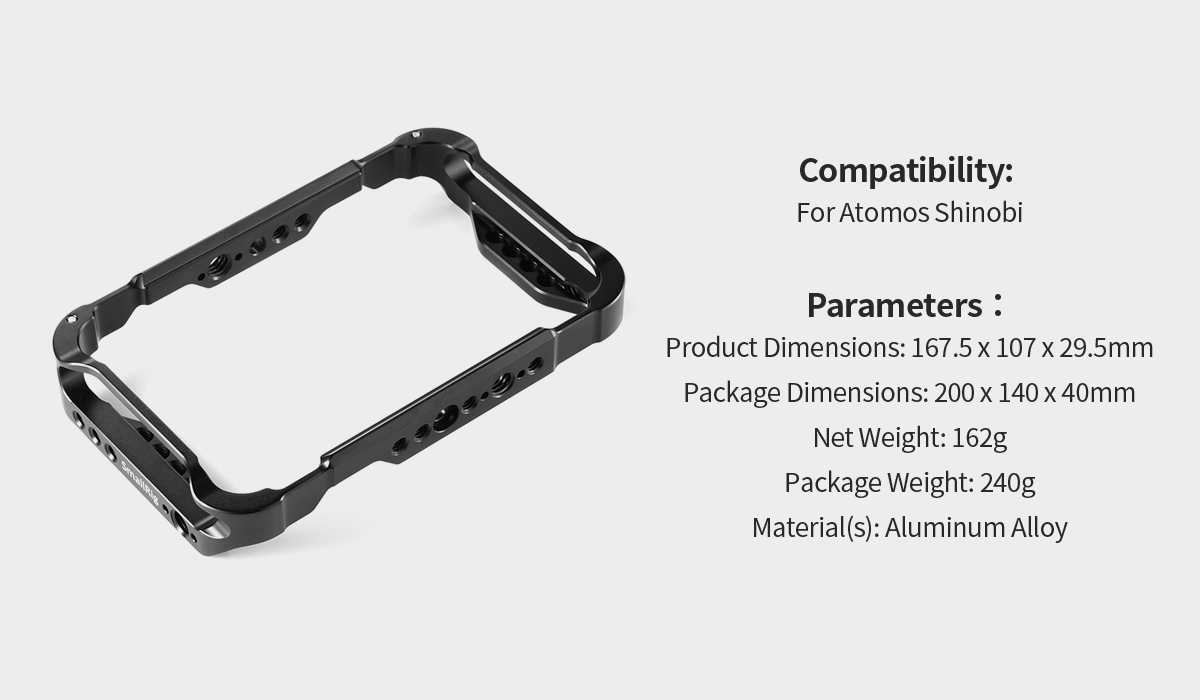 SmallRig AtomX 5" kavez za Shinobi CMA2305 dizajniran je kako bi pružio dodatni zaštitni egzo-skelet za monitor, sa širokim rasponom industrijskih standardnih točaka za montažu. Kavez se montira na monitor pomoću dva vijka 1/4"-20 na vrhu i dnu. Kavez ima više rupa 1/4"-20, 3/8"-16 na svim stranama, kao i na stražnjoj strani monitora za maksimalnu fleksibilnost u opcijama montaže. ARRI točke za lociranje mogu se naći na svim stranama, a NATO šine su također predviđene na vrhu i dnu kako bi se omogućila upotreba s nizom SmallRig nosača. Kavez uključuje jednu HDMI stezaljku za kabel koja radi s nizom Atomos kabela i više za zaštitu HDMI kabela i priključka. Ima podignute točke za pričvršćivanje na vrhu i dnu kaveza za upotrebu s remenima za vrat i za smještaj okvira Atomos Ninja V Sunhood.