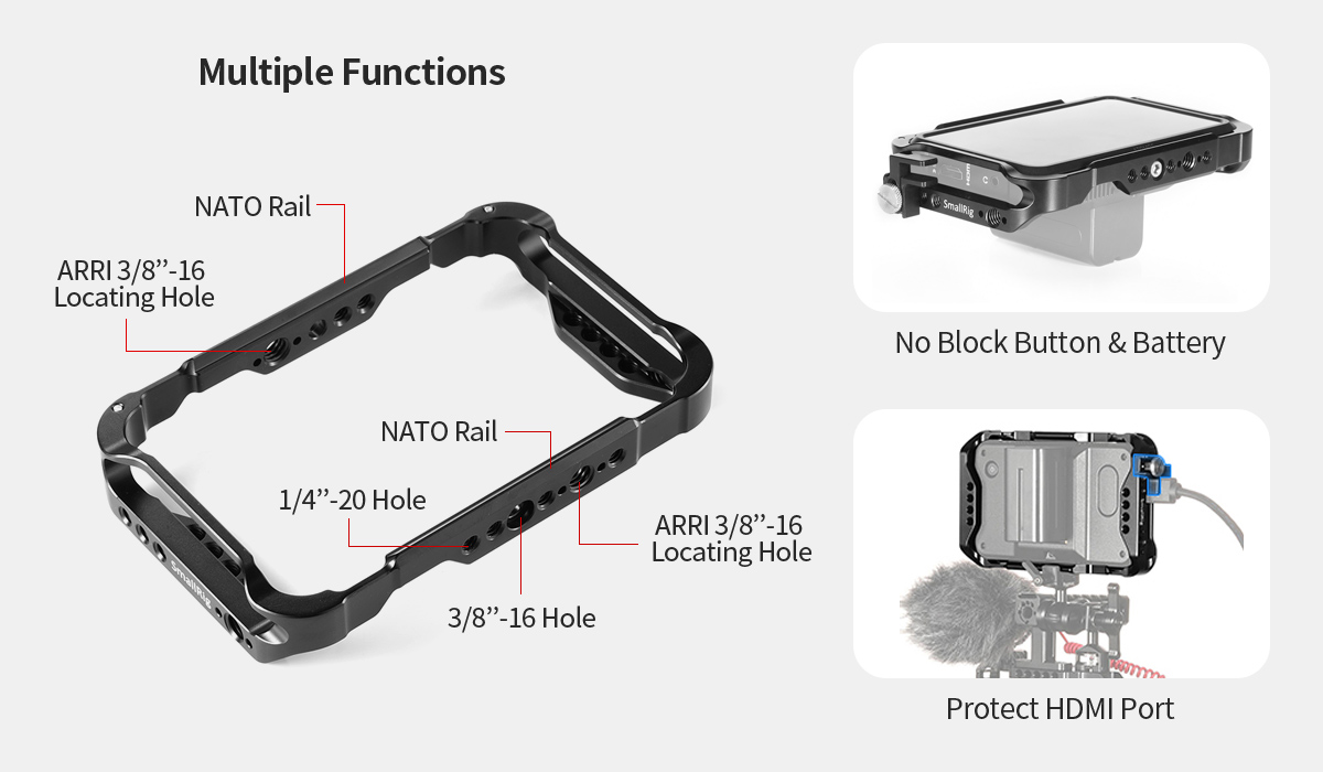 SmallRig AtomX 5" kavez za Shinobi CMA2305 dizajniran je kako bi pružio dodatni zaštitni egzo-skelet za monitor, sa širokim rasponom industrijskih standardnih točaka za montažu. Kavez se montira na monitor pomoću dva vijka 1/4"-20 na vrhu i dnu. Kavez ima više rupa 1/4"-20, 3/8"-16 na svim stranama, kao i na stražnjoj strani monitora za…