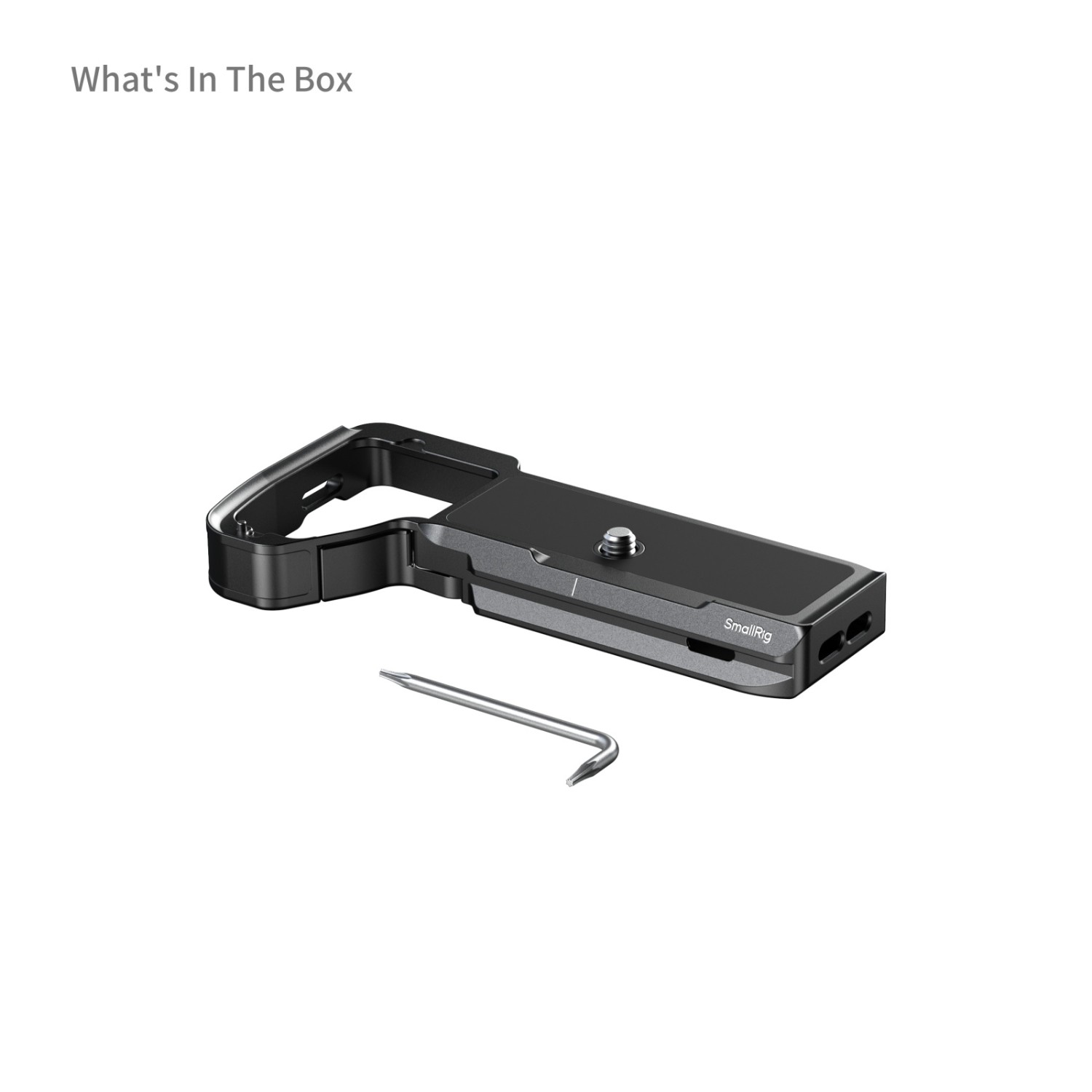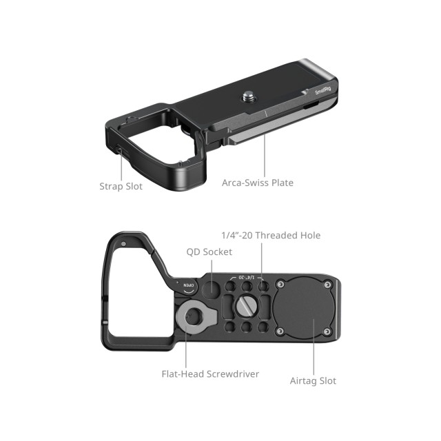 Pričvršćuje se na kameru vijkom 1/4"-20 i opremljena je zaštitnim jastučićima za sprječavanje ogrebotina i deformacija. Ova montažna ploča opremljena je utorom za AirTag , koji vam omogućuje pričvršćivanje uređaja za praćenje AirTag i besprijekorno praćenje kamere. Osim toga, opremljena je zglobnom rukom u odjeljku za bateriju koja poboljšava ergonomiju i pruža potporu za mali prst.