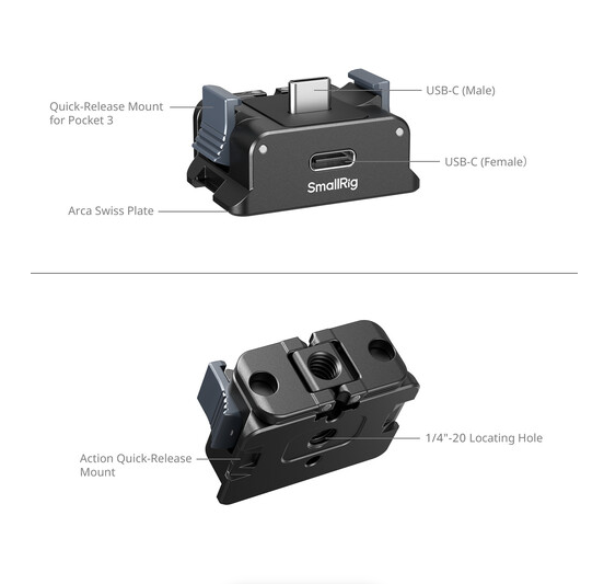 SmallRig adapter za bateriju za DJI Osmo Pocket 3 precizno je konstruirano rješenje za montažu koje poboljšava stabilnost i vrijeme rada vaše kompaktne gimbal kamere. Sklopivi adapter s 2 kontakta sigurno učvršćuje Osmo Pocket 3 na mjestu, dok integrirana silikonska podloga štiti bazu kamere i poboljšava prianjanje tijekom snimanja iz ruke. Ugrađeni muški USB-C priključak prenosi napajanje izravno na kameru iz vanjskog izvora putem ženskog USB-C ulaza, omogućujući kontinuirano snimanje bez brige o bateriji. Baza integrira potpuno kompatibilnu ploču s Arca-Swiss standardom za trenutno pričvršćivanje stativa ili glave gimbal kamere, plus navojni otvor od 1/4"-20 protiv uvijanja za dodatnu fleksibilnost montaže na nosače, platforme ili stezaljke. Izrađena od izdržljive crne aluminijske legure, ova ultra lagana ploča od 1,2 oz (33 g) mjeri samo 1,5 x 1,1 x 0,8" i savršena je za brze filmaše, vlogere i kreatore akcijskih scena koji zahtijevaju brzu, pouzdanu i napajanu montažu na terenu.