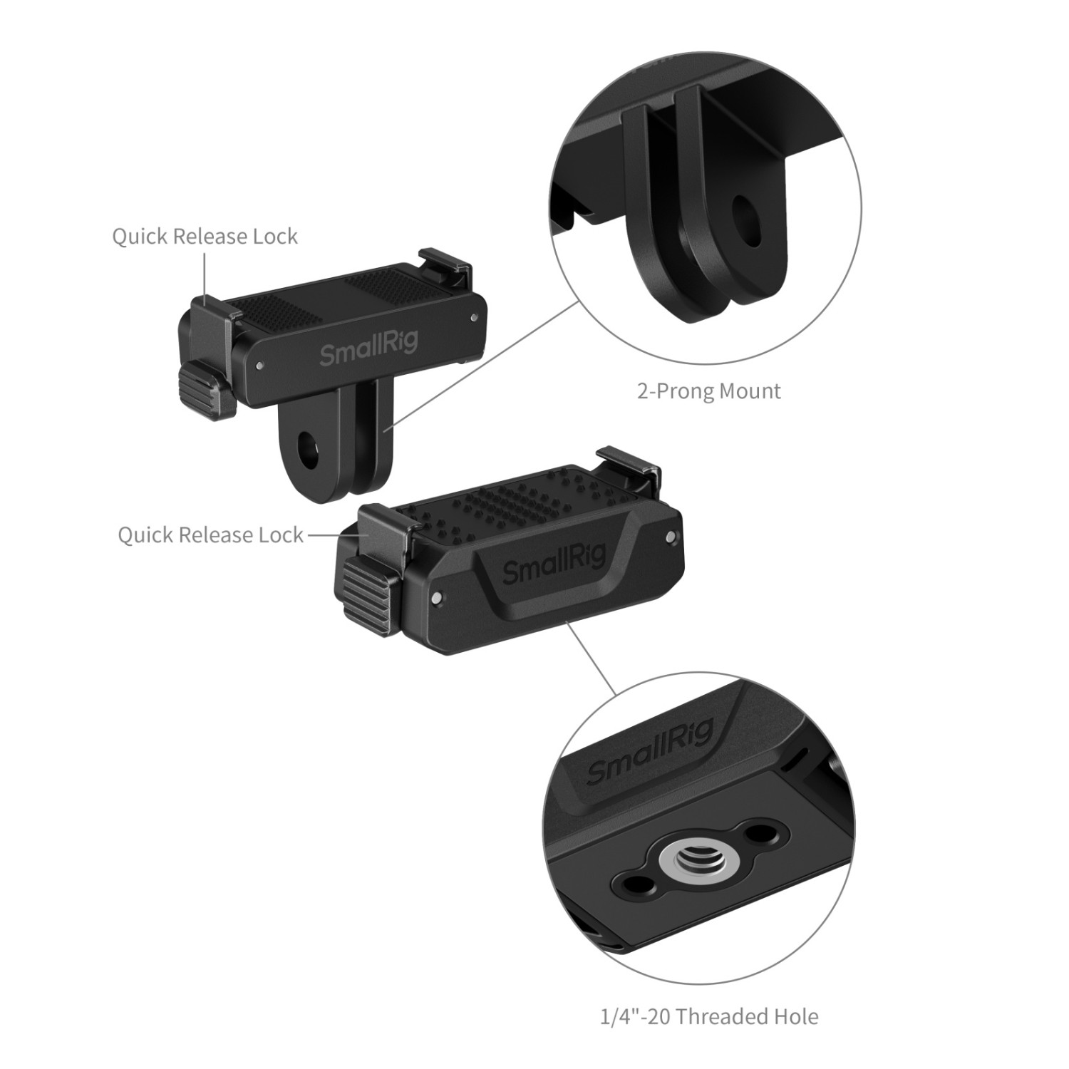 SmallRig dvosmjerni adapter za brzo otpuštanje s 2-krakim nosačem i navojnim otvorom od 1/4"-20 5918 pruža siguran, stabilan i brz nosač za profesionalne fotografe i snimatelje. Nosač je dizajniran za akcijske kamere DJI Osmo Nano i Osmo Action 6.