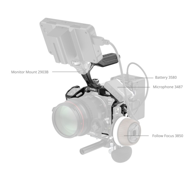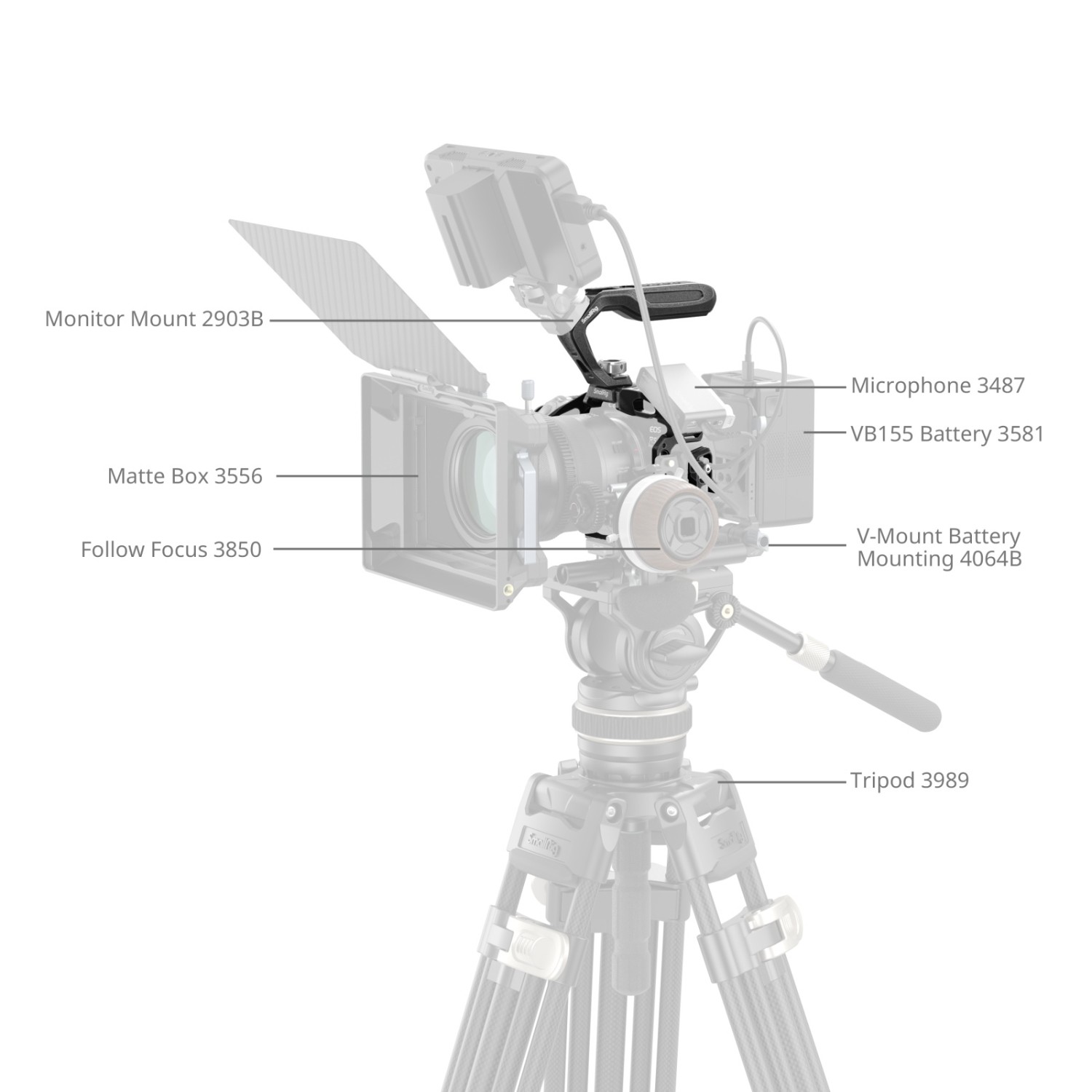 Ergonomska gornja ručka omogućuje udoban hvat, što snimanje iz niskog kuta i jednostavno nošenje čini lakim. Kavez ima više točaka za montažu, uključujući navojne rupe 1/4"-20, locirajuće rupe 1/4"-20, navojne rupe 3/8"-16, locirajuće rupe ARRI 3/8"-16, nosač za hladnu papučicu, Arca-kompatibilno sučelje, QD utičnicu i utore za remen. Ove svestrane opcije omogućuju korisnicima pričvršćivanje monitora, mikrofona, stativa, sustava za fokusiranje, ručki i druge dodatne opreme, podržavajući širok raspon potreba za stvaranjem videa.