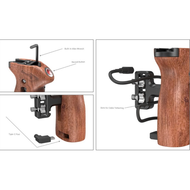 SmallRig bočna ručka s navojem i Start/Stop daljinskim okidačem 3323 dizajnirana je za pružanje praktične Start/Stop kontrole snimanja za stabilno i udobno snimanje. Ergonomski dizajnirana sve-u-jednom drvena ručka poboljšava iskustvo držanja. Čvrsto se pričvršćuje na kavez s dva navoja 1/4"-20 i podesivom visinom. Njegov gornji dio opremljen je rupama s navojem 1/4"-20, 3/8"-16 i hladnom utičnicom za 2904 i 2905 nosač monitora.