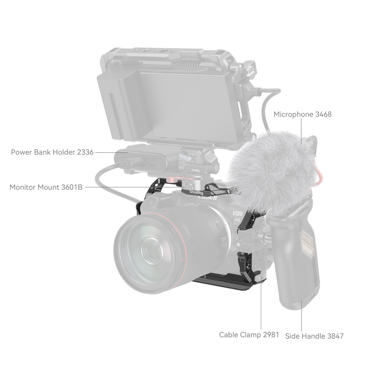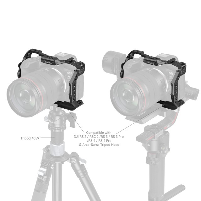 SmallRig HawkLock Quick Release Cage za Canon EOS R6 Mark II 4159B dizajniran je za pružanje zaštite i pričvršćivanje dodataka. Zaključava kameru pomoću jednog 1/4"-20 vijka na dnu i jednog bočnog adaptera za zaključavanje s obje strane, s gumenim jastučićima koji sprječavaju ogrebotine. Kavez održava pristup gumbu kamere, ugrušku kartice, zaslonu i vratima za bateriju te dolazi s više nosača za dodatke. Oni uključuju, između ostalog, 1/4"-20 otvor s navojem, 3/8"-16 otvor s navojem i ARRI 3/8"-16 rupa za lociranje koja podržava bočnu ručku 2093 i 3814, gornju ručku 3765, nosač monitora 2903 i 2904, Manfrotto donju ploču 1280 i 2458, držač za prijenosne Power Banke 2336 i mini V ploču za bateriju 2987. 1/4"-20 rupe za lociranje s obje strane odgovaraju Single Rod Clamp 3598 i Magic Arm 3873, a dvije 1/4"-20 rupe s navojem u vodoravnom smjeru s desne strane osiguravaju stabilno okomito snimanje.