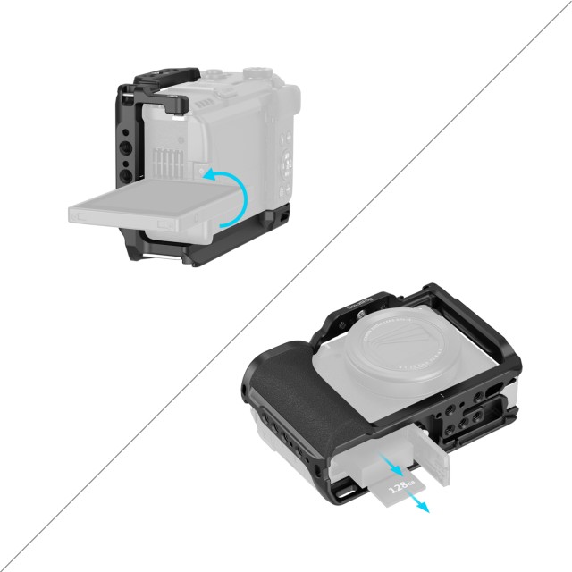 Osim toga, kavez omogućuje potpuni pristup svim gumbima i sučeljima fotoaparata, uključujući odjeljak za bateriju i utore za memorijske kartice.