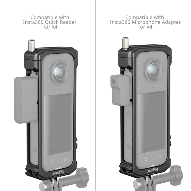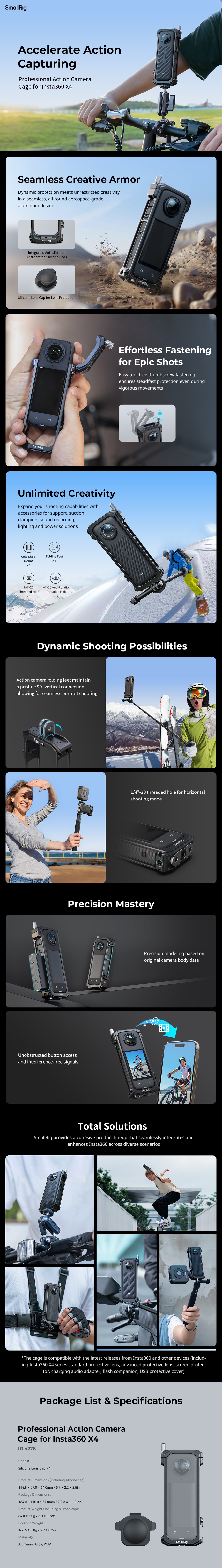 SmallRig Cage za Insta360 X4 4278 pruža zaštitu kamere i razne dodatke za proširenje sučelja za dodatnu pogodnost tijekom snimanja. Uz dizajn s bočnim otvorom, kavez omogućuje nesmetan pristup vratima za bateriju što omogućuje brzu promjenu baterije bez rastavljanja kaveza. Kavez čvrsto pristaje akcijskoj kameri, s unutarnjim silikonskim jastučićima koji sprječavaju grebanje kućišta kamere. Kamera se postavlja u kavez s gornje strane i učvršćuje vijkom, ne zahtijevajući nikakav alat za instalaciju. Kavez ima držač za hladno držanje i 1/4"-20 otvor za navoj protiv uvijanja sa strane za pričvršćivanje mikrofona, LED video svjetla i drugih fotografskih dodataka. Donje sučelje akcijske kamere može se sklopiti za pohranu, a također ima otvor za navoj od 1/4"-20 za izravno pričvršćivanje stativa s vijcima od 1/4"-20, selfie štapova ( 4758 ) i više. Dolazi sa silikonskim poklopcem za objektiv za zaštitu objektiva tijekom skladištenja.